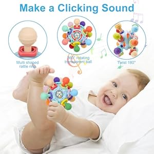 Multi-Sensory Baby Toy: This baby sensory toy uses 12 kinds of bright colors and textured silicone balls to stimulate baby’s senses. The rattle ring, twisting clicking ball and rotating ball also allow baby to have more sensory fun