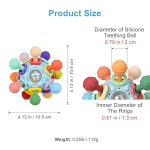 Product size: 4.13*4.13*2.76 inch / 10.5*10.5*7 cm, Product weight: 0.25LB / 112g, Inner diameter of rings: 13mm / 0.51 inch, Diameter of silicone teething ball: 20mm / 0.79 inch. This baby toy has been tested by a CPSC approved laboratory to the ASTM F963-23 and CPSIA standard, safe to use!